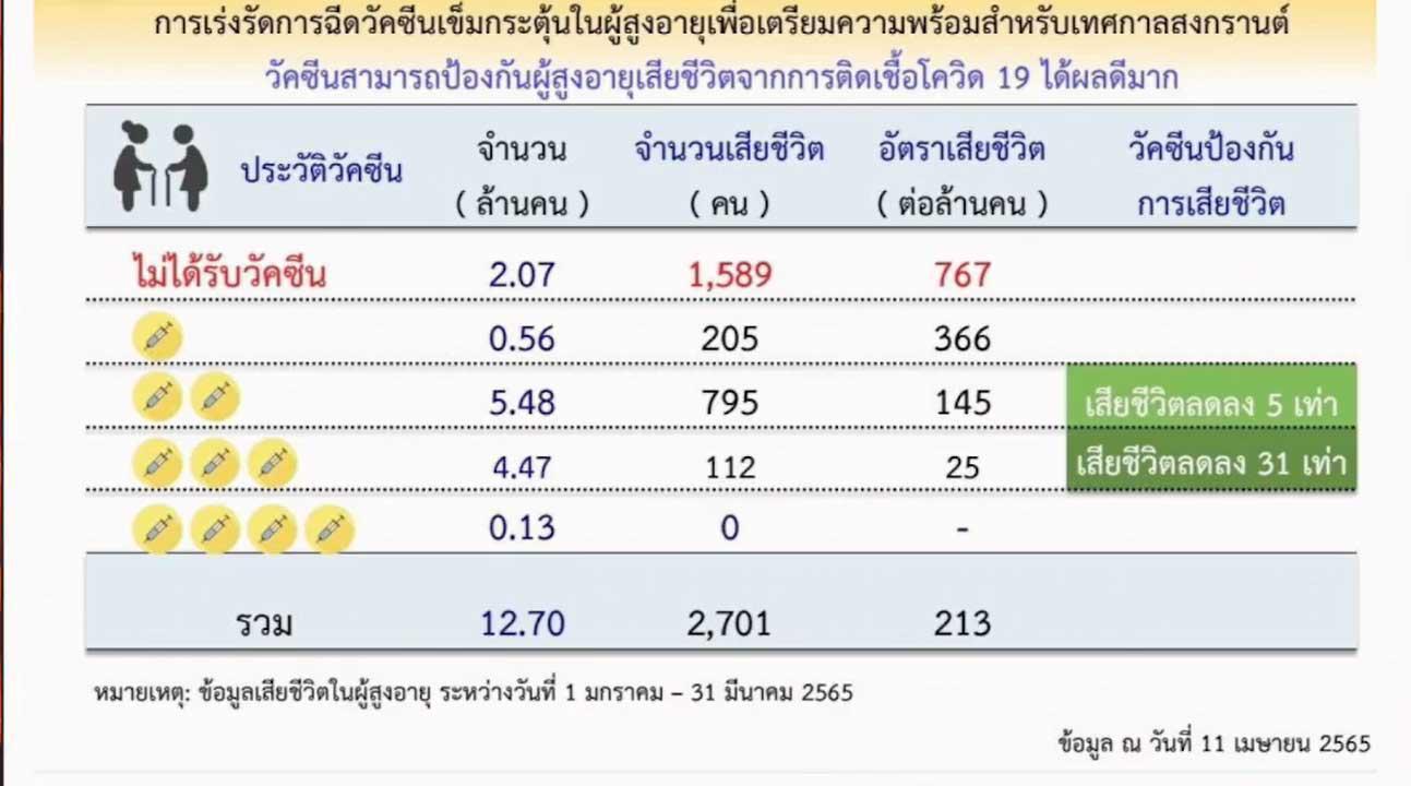 นอกจากนี้ ข้อมูลของกรมควบคุมโรค นำข้อมูลการเสียชีวิตต่อล้านคนมาเทียบ พบว่าคนไม่ฉีดวัคซีนเสียชีวิตไปที่ 767 ต่อล้านคน ขณะที่ฉีดวัคซีน 1 เข็มเหลือเสียชีวิต 366 ต่อล้านคน เมื่อฉีด 2 เข็ม พบเสียชีวิตเหลือ 145 ต่อล้านคน ฉีดวัคซีนบูสเตอร์เป็น 3 เข็ม พบเสียชีวิต 25 ต่อล้านคน หรือเสียชีวิตลดลง 31 เท่า ส่วนฉีด 4 เข็มยังไม่มีผู้เสียชีวิตเพราะตัวเลขฉีดยังน้อยอยู่