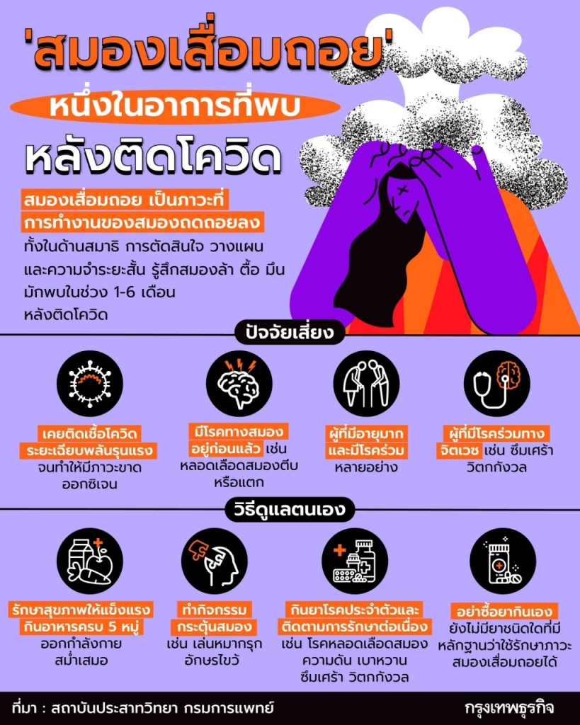 หลัง ติดโควิด 1-6 เดือน อาจพบอาการภาวะ สมองเสื่อมถอย หนึ่งในอาการ Long COVID ที่หลายคนอาจคาดไม่ถึงหรือมองข้ามไปก็คือ ภาวะ “สมองเสื่อมถอย” โดยพบได้หลังจาก ติดโควิด 1-6